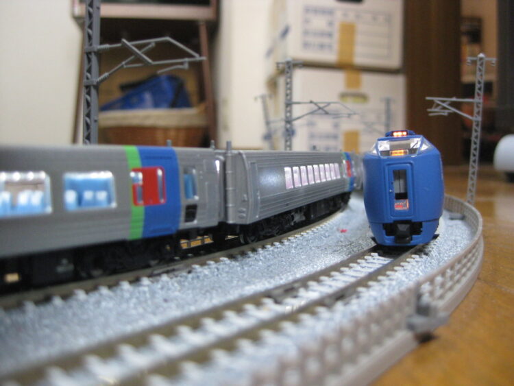 以前、キハ281/283系「スーパー北斗」の中間先頭車のカプラー交換に失敗し脱線頻発だったのですが、知人にアドバイスいただきTNカプラーに換装しました。車間距離もちょうどいいですね…カッコよくなりました!お陰様で安定した走行を魅せてくれています。