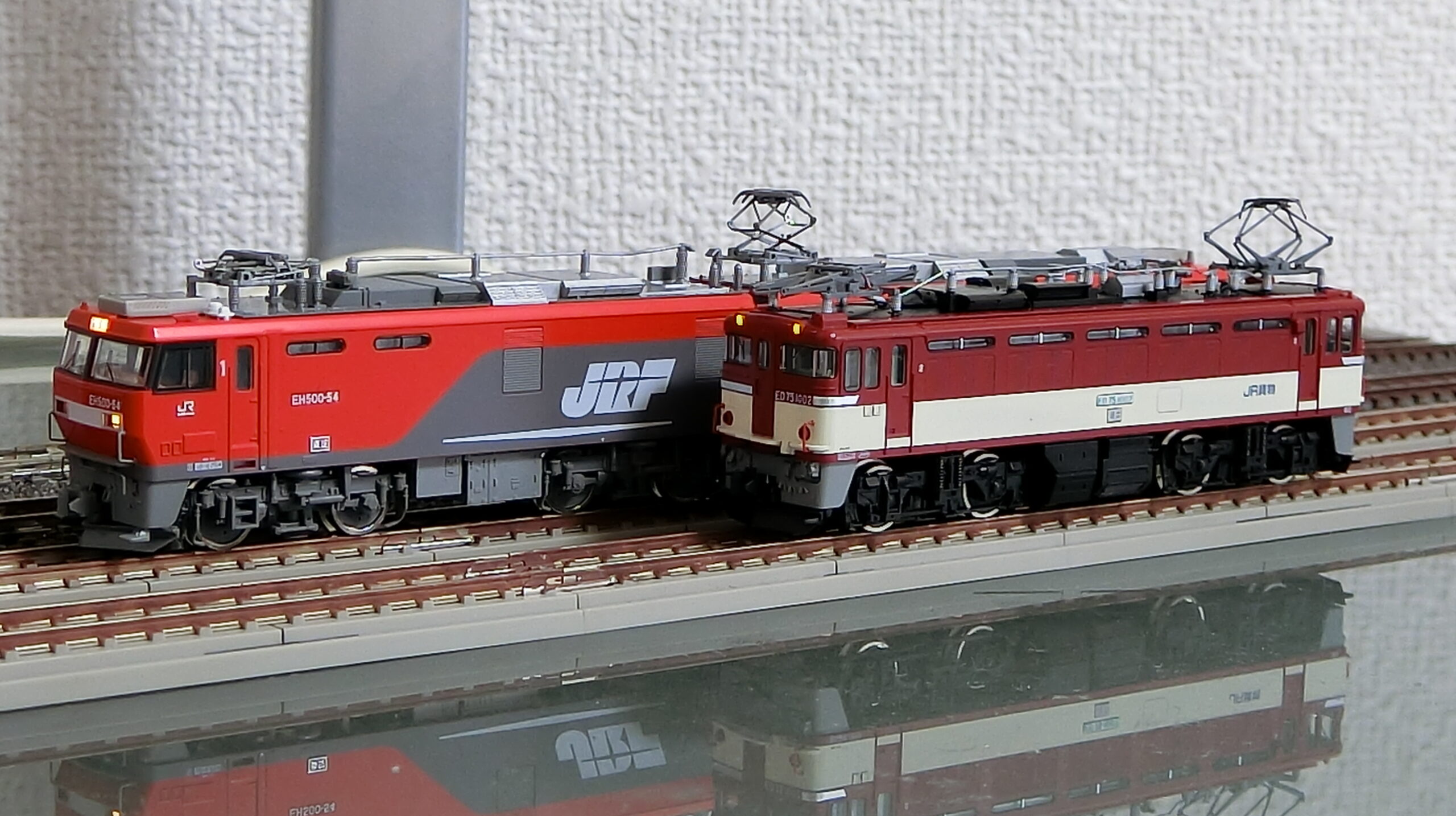 当区においては機関車はTOMIXで揃えることが多いため、もれなくED75もEH500もTOMIX製です。屋根上が賑やかな交流機ですので、碍子が塗り分けされた最新のKATO製の方が見応えあるでしょうね。しかしED75については、重連運用が主でしたのでライトが消灯できるTOMIX製の方が都合が良かったんです。