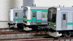 BMTNカプラーですが、この混成編成が発売されたころにSP化されたのですが、初期ロットが白っぽく粉を吹いていたんですね・・・そうすると動きが鈍くなりセンターに戻らなくなることがありました。クリーニング液を湿らせた綿棒で吹き上げると復活することはありますが、TNカプラーも消耗品と考える必要がありそうです・・・(最新ロットは黒々としており滑らかに動きますね)。