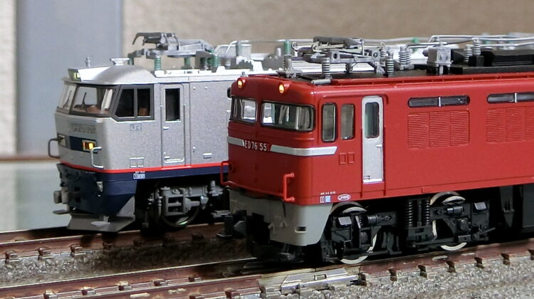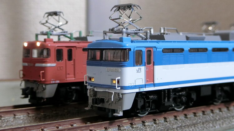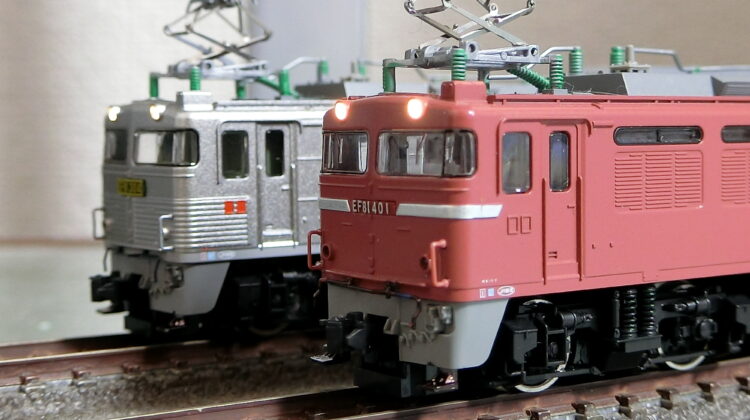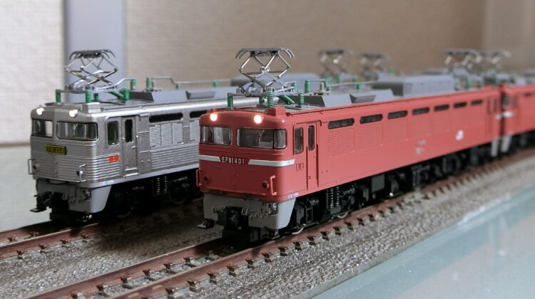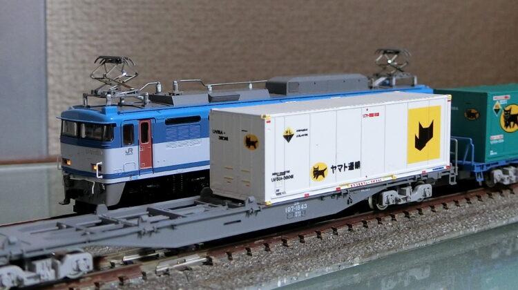 牽かれるコキ&コンテナの増備がなかなか進みませんが…いずれは30(31)ftの私有コンテナ満載の列車を仕立てたいですね!24両編成もEF81重連なら余裕で牽いてくれることでしょう。450番台の前後期型も入線しています。ヘッドライトが特徴的な前期型を先頭にする想定です。こちらは碍子を何故か白に色挿ししています(他は緑です)。