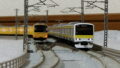 E233系との離合が最高です。屋根上のアンテナが少なくすっきりしていますね。ラジオアンテナすらないので線路に並べる際に左右の向きが分からなくなりました。私には床下機器の向きでは分からないので、HPかカタログ写真で確認しています。
