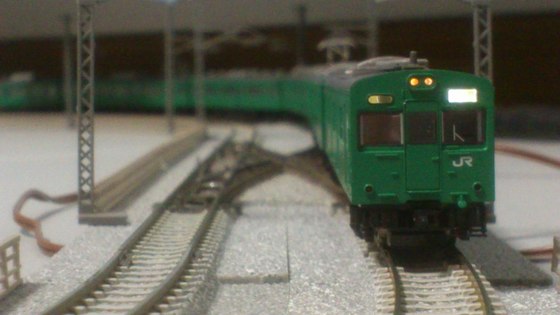 画では黄色が強く見えますが実際はもっと白っぽいです。また、車体が右に傾いているように見えるのは集電スプリングが曲がっているためで後程修正しました。