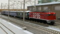 またセンゴックに牽かせました。なんだか専用機にしたいくらいです!黒く物々しい貨車に青いロゴ入りの車体が良く映えてカッコいいんですよ。画像を見ていますと通常の更新色や、EF65-57の牽引もあったようですね。再現したくなります。模型とはいえ荷が載ると違います・・・重量感が増した気がします。ダダダダ・・・ダダダダとジョイント音4連打が楽しめます。これを聴くだけでも購入した甲斐があったってもんです。