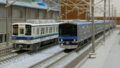 お約束のバックショット… 黒台車(ダークグレーですが)の付属編成との組み合わせもやりたいですね!実際に、15両フル編成が全検明けの綺麗な台車で走る姿は見ないですから。広い貸しレで爆走させたいです!