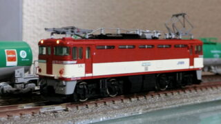 こんど再生産です。待っていた方もいるのではないでしょうか。丸目の前期型はよく見掛けますが、後期型は市場から消えたように思います。実は、この車両は「押し太郎」ことEF210-300が補機として付く際の本務機として先頭に立ってもらうつもりで入線させました。