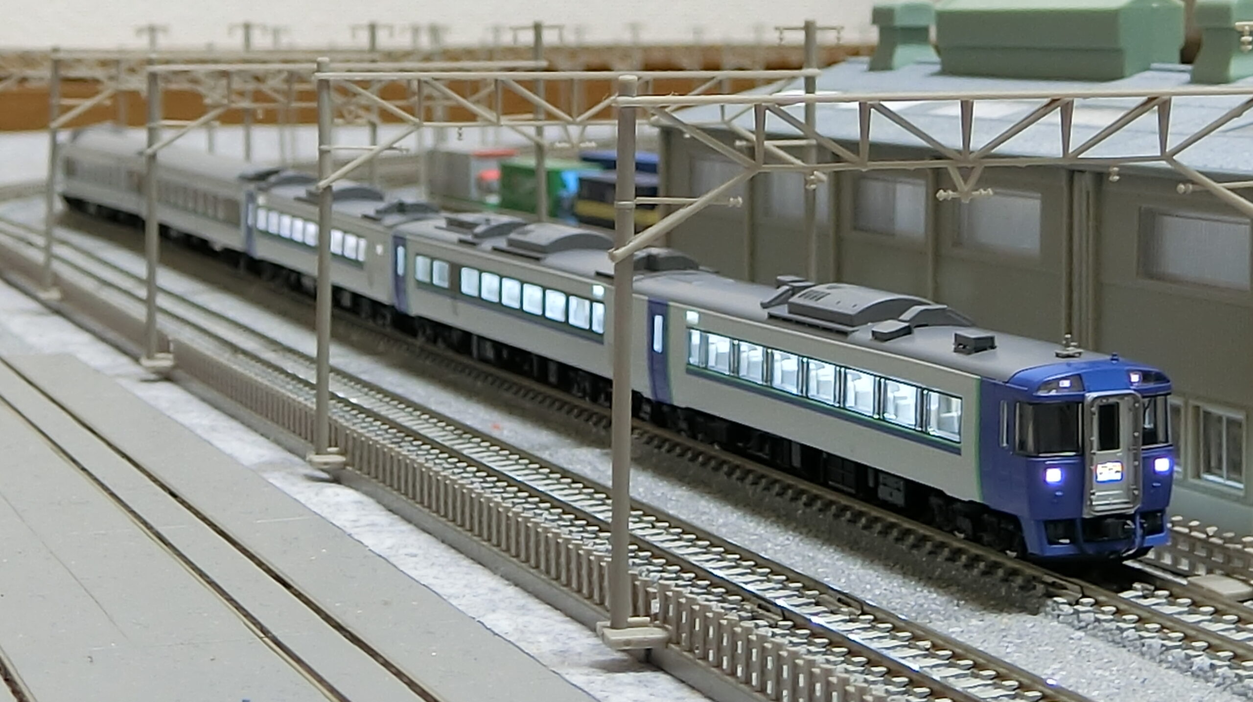 北海道の特急型が好きで何本か持っておりますが、国鉄型のキハ183系が特に好きです。このまりもセットですが、とかち色のスラントノーズ200番台とHET色の貫通扉付き500番台の混成が面白いですね。しかも寝台が2両組み合わされるのです。整備内容としては、当区の標準仕様でカプラーは全車BMTN化、トイレタンク取り付け、既製品の室内灯取り付け、を施しています。トイレタンクは実車と形状が違うと思われますが、485系などの余りが多くありますので、各型式の画像で向きをチェックして取り付けています。雰囲気重視ですね。改善点もありまして、青白いヘッドライトと室内灯が明る過ぎるように感じます。色挿しと減光が必要でしょう。また、夜行列車らしい雰囲気作りのため全車にカーテンを取り付けたいです。