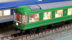 なんとなく合うんじゃないかと12系客車も出してみました。赤い機体に青い客車が似合わない訳ないのですが、白帯の12系ですと特別感があるように見えます。こんな団臨があったような?!この12系は頑張って座席塗装しております。室内灯はTOMIX純正からテープLEDによる自作品に換えていまして、透明感のある灯りに仕上がりました。若干短くてデッキに灯りが届きにくいのですが雰囲気は十分です。