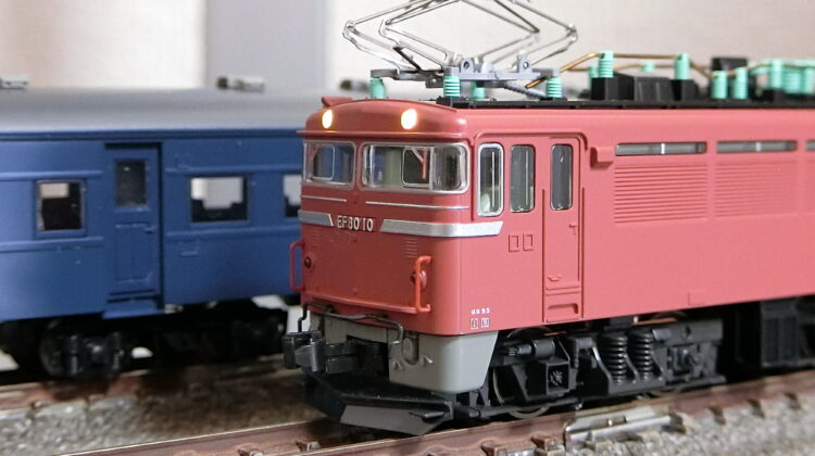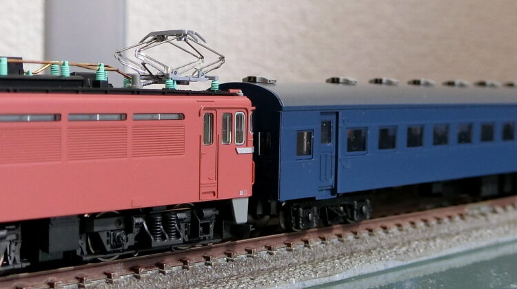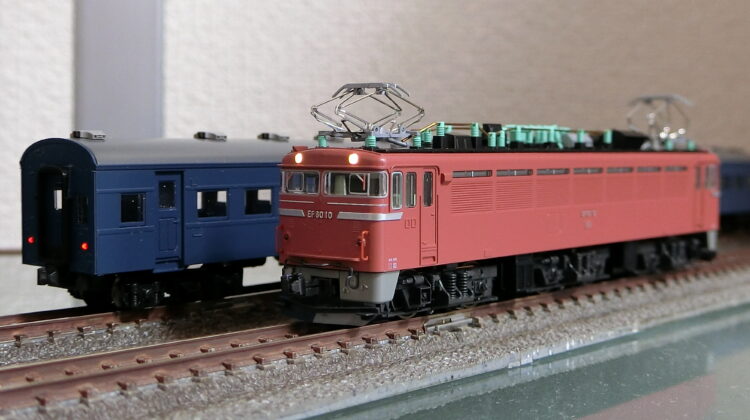 牽引機はKATOのEF80前期形です。大きなひさしと菱形パンタが武骨です。いつも煤汚れている働き者の印象ですが、ピカピカなのは模型ならではってことで。