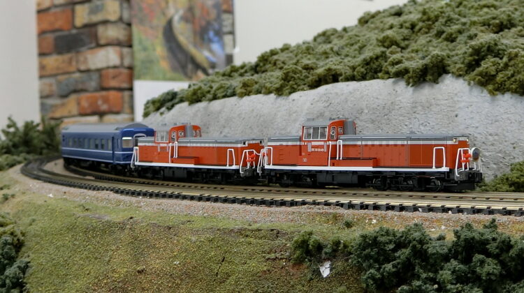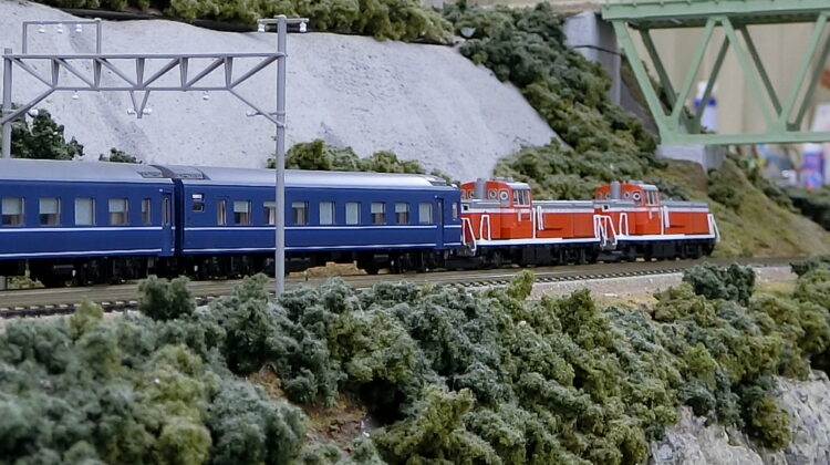 今回は田舎レイアウトの10番線を予約しました。3%の勾配があるのでそれなりに選んできたつもりだったのですが…今回の目玉 TOMIX 400系新幹線 7両編成が上り勾配で空転立ち往生したのは想定外でした。短編成なので大丈夫と思っていたのですが…残念です。トラクションタイヤを新しいものに換えていたら状況が変わったかもしれませんね。また、KATO DE10重連は空転しながらかろうじて上りました。スムーズな走行とはいきませんでしたので24系は9両に減車しています。軽量なDE10の弱点でありますね。