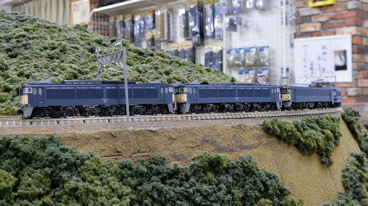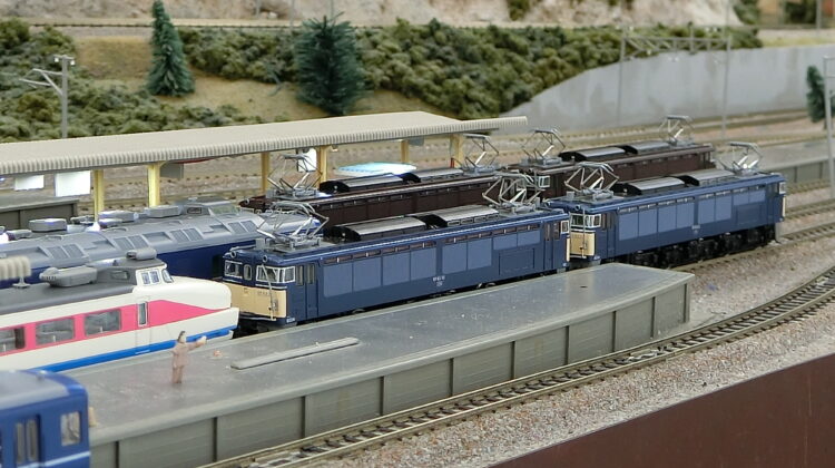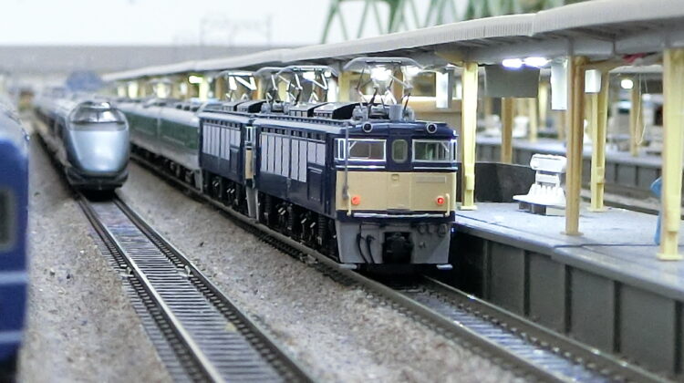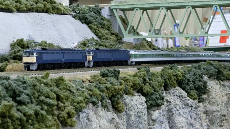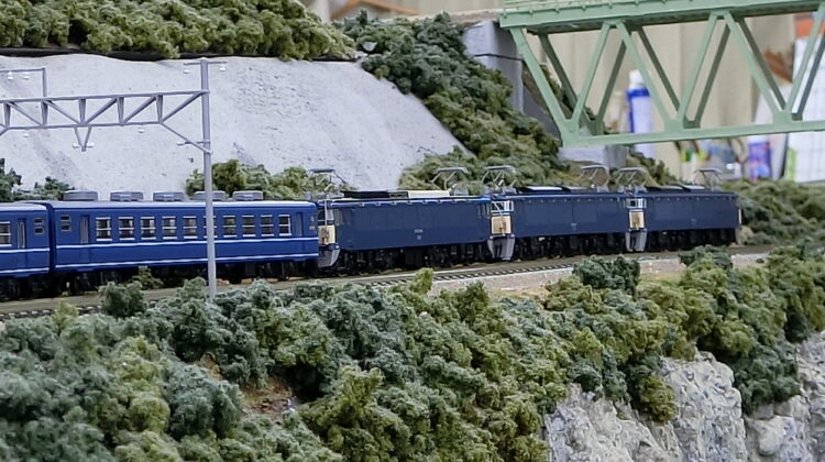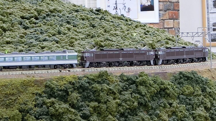 EF62が牽引する12系客車をEF63がフォローし降坂する…なんと3重連。6丁パンタが圧巻で見応えがありますね!模型の運転も下りで速度が出過ぎないようコントロールします。