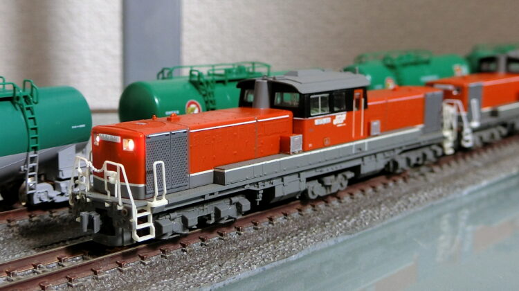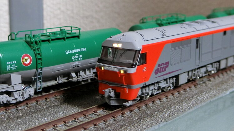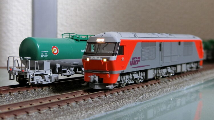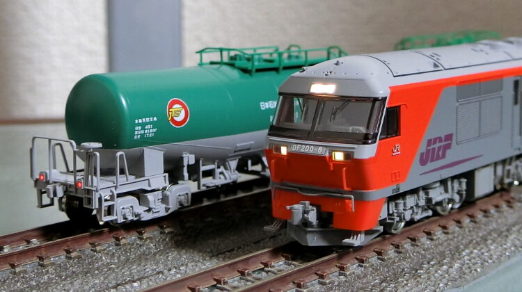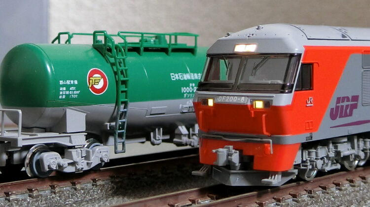 グリーンのタンク車に赤い機関車が映えます。稲沢のDD51更新色重連も違った魅力がありますが…DF200の力強さは模型でも伝わってきてカッコいいのです。実際、TOMIXのDF200はかなり重く、何両でも引き出しそうな雰囲気があります(試してませんが)。恐らくですが…50両くらい牽けるのではないでしょうか。