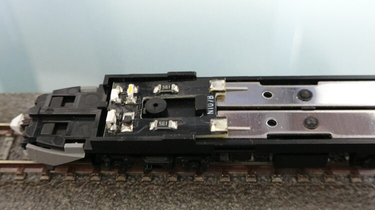 KATOのレールクリーナーと綿棒で接点を磨き上げて終了です…点灯しました。その他、基盤から生えている接点(シュー)の角度を調整したくらいです。また、このクロ481‐2000ですが、窓ガラス周りと運転台に色挿しを施しプラパーツの色が出ないようにしております。