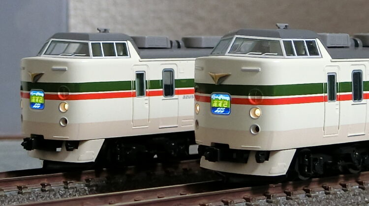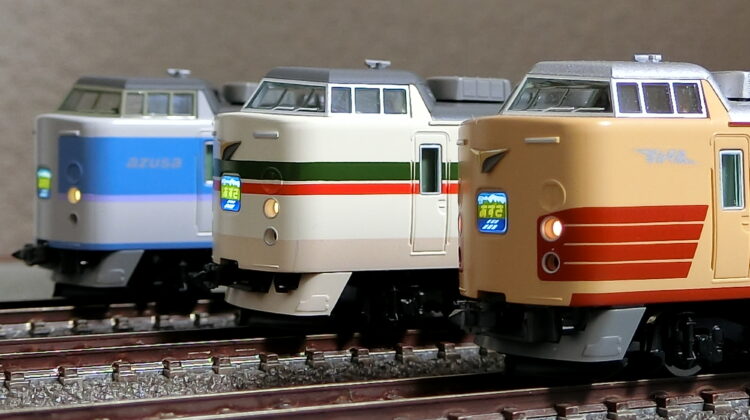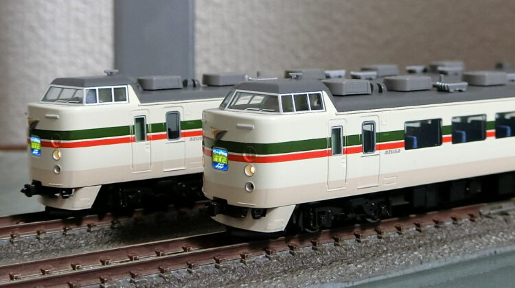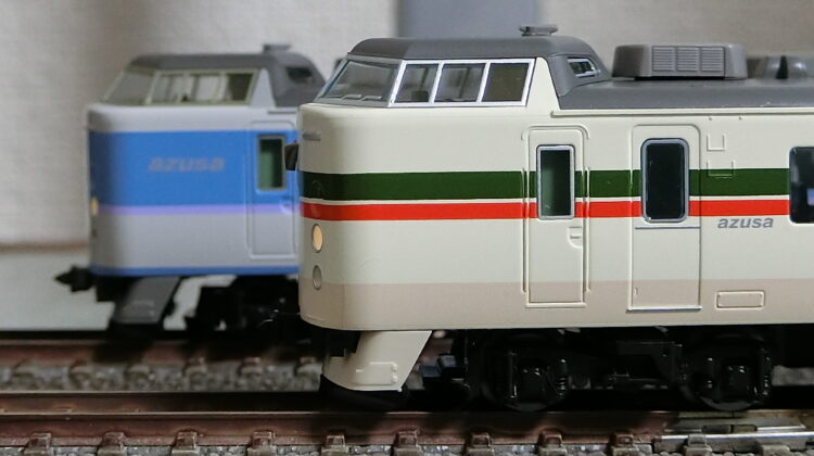 模型は、KATO・TOMIXどちらも製品化していますが、TOMIXが最新スペックでトリコロールカラーを製品化していますので飛び付きました。グレー屋根にシルバーのベンチレーター、Wパンタのモハ182(0番台はモハ183にパンタ)がいいですね。取り急ぎ取説通りにパーツを取り付けたのみで室内灯も色挿しもしていませんが、さすがTOMIX HGだけあって存在感は抜群です。クハの運転台側カプラーがTNからダミーに変わりましたね。連結する予定はないので、より小型なダミーカプラーの方が実感的です。