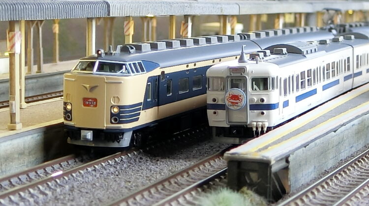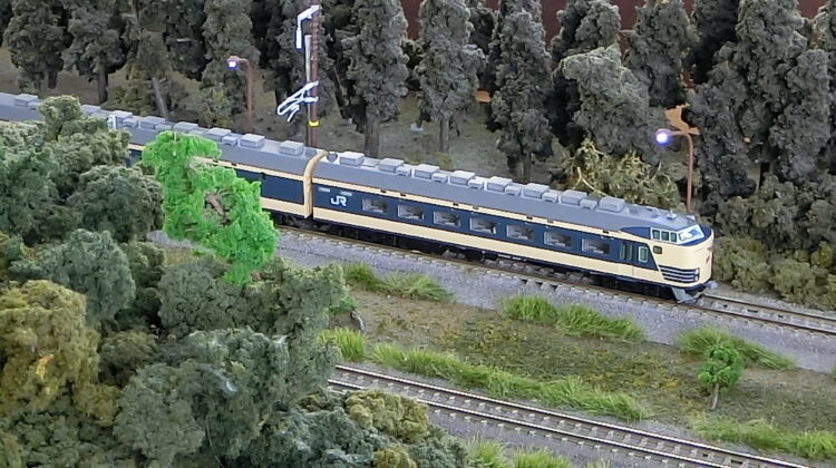 自宅では動力車のみ試運転程度に数㎝動かしただけですので、早く大きなレイアウトで走らせてやりたかった…Re-Colorでそれが叶ってよかったです。(正直なところ)JRマークが貼られると魅力が半減しそうな583系ですが…9両編成に減車されサシ581が組まれていませんが雰囲気は十分です。赤いイラストの「ゆうづる」が泣かせますね。