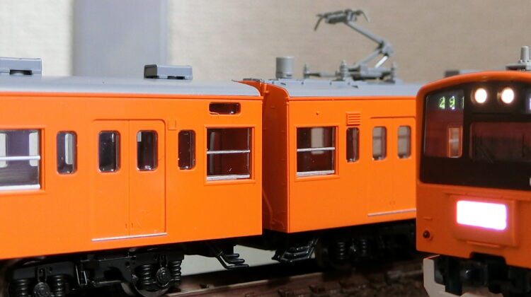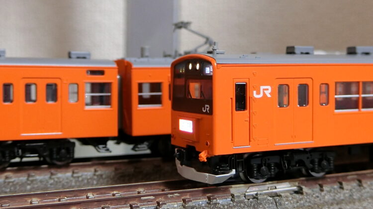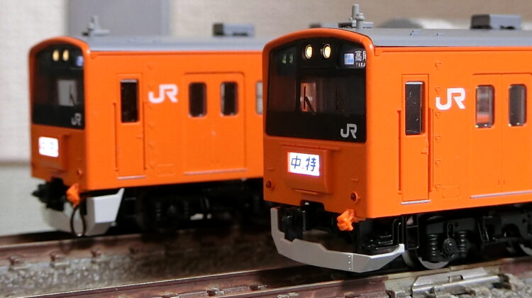 201系はKATOの牙城だったのですが、TOMIXが製品化と聞いたときは飛び上がりました。KATOのは古さが否めなかったので、TOMIXに期待しましたね。結果、最新の金型ですから決定版と言える製品に仕上がりました。TNカプラーに交換する手間とコストは必要ですが、電球色に輝くヘッドライト、白色に灯る行燈…最高の出来映えです。個人的には、ヘッドライトのリムが少し奥まって見えるところがいい感じなんですよね。